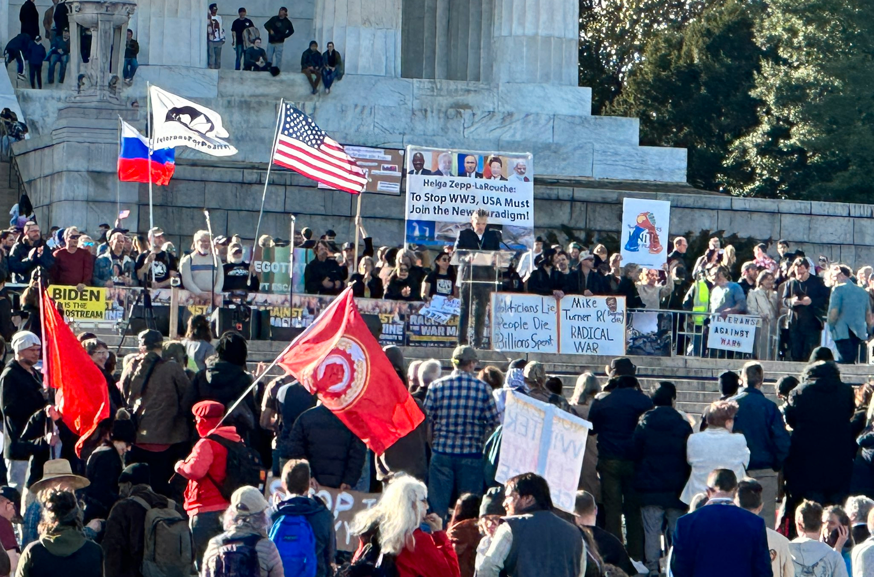 «... у мемориала Линкольна собрались около сотни человек. Протестующие держат транспаранты против «поддержки нацистов на Украине», а также российские флаги. У одного из участников акции в руках плакат с основной мыслью статьи журналиста Сеймура Херша: «Байден подорвал «Северный поток».