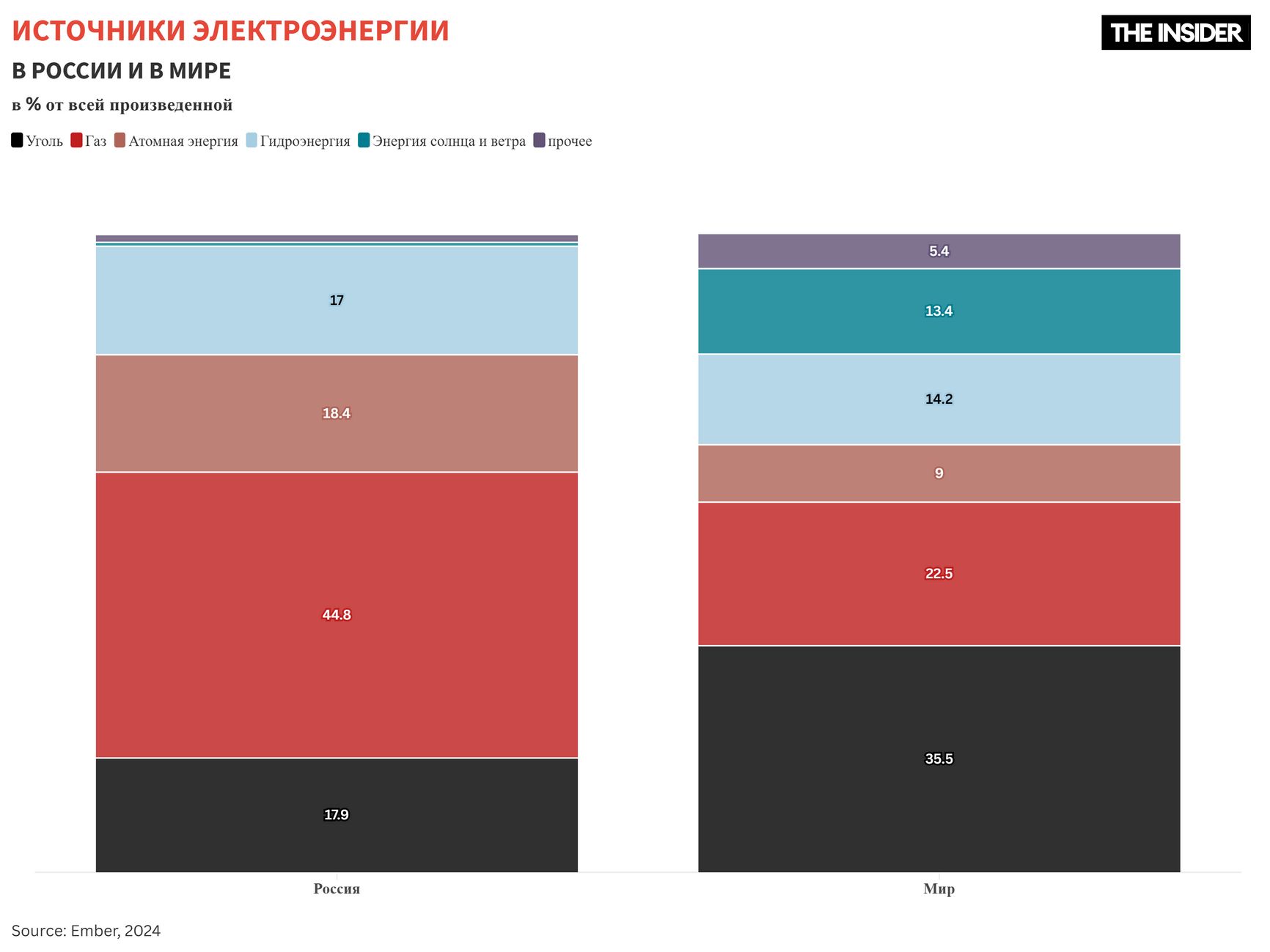 Если подходить к вопросу о «чистоте» российской энергетики, руководствуясь мировыми критериями (которые причисляют к «чистым» в том числе большие ГЭС и АЭС), то доля «чистой» электроэнергии в России составляет 37,2%. Это даже хуже, чем в среднем по миру (42%). И это если не рассматривать автотранспортный сектор, который в России полностью работает на ископаемом топливе, а также отопительный сектор, энергопереход которого в России еще практически даже не обсуждался.