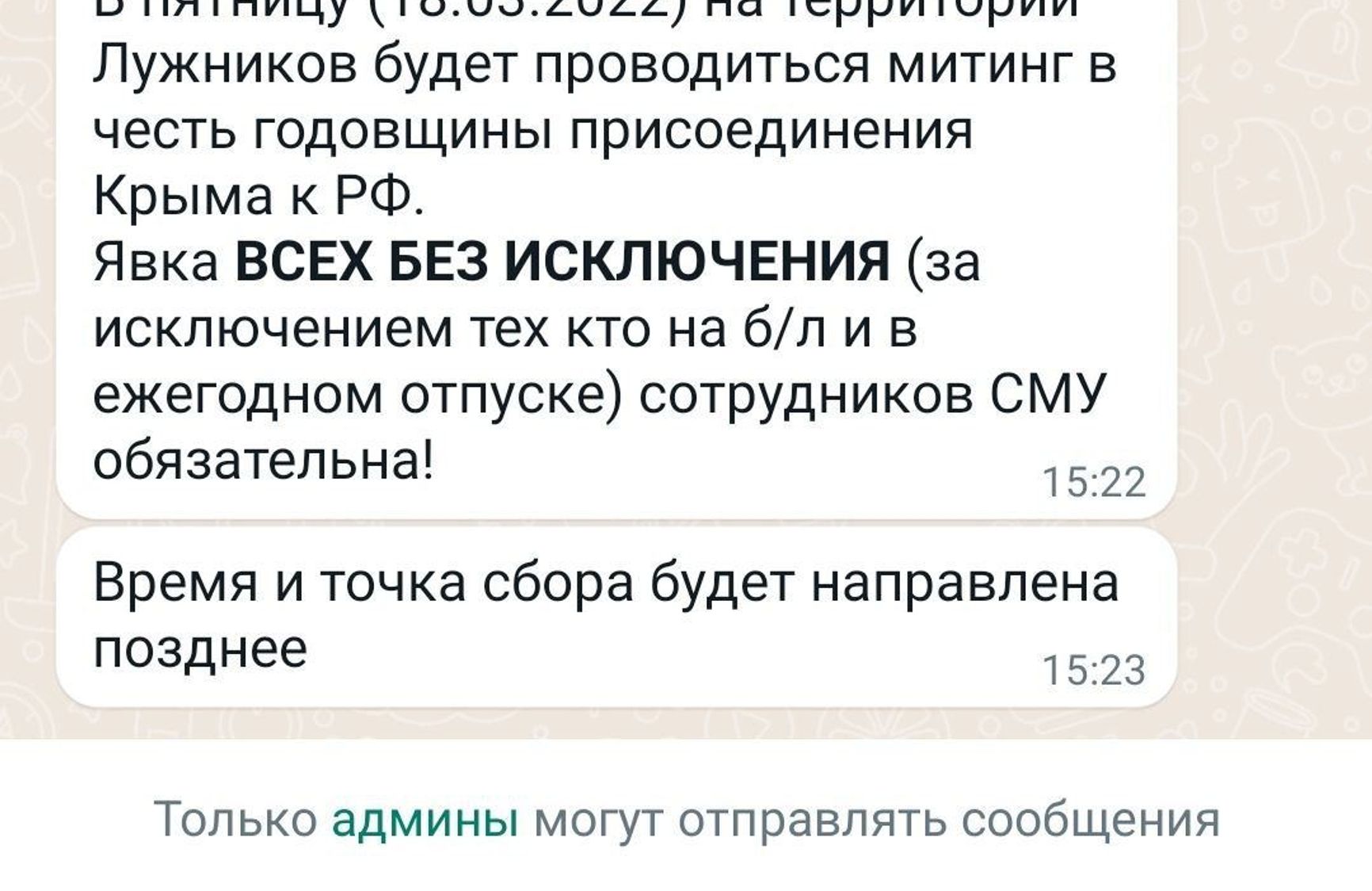 18 марта в России пройдут патриотические акции по случаю годовщины аннексии Крыма и в поддержку войны в Украине. Центральным событием станет концерт в Лужниках с участием эстрадных артистов. Об этом сообщает Telegram-канал «Можем объяснить», который публикует скриншоты сообщений от руководства государственных предприятий, школ и других бюджетных учреждений, присланные читателями канала.