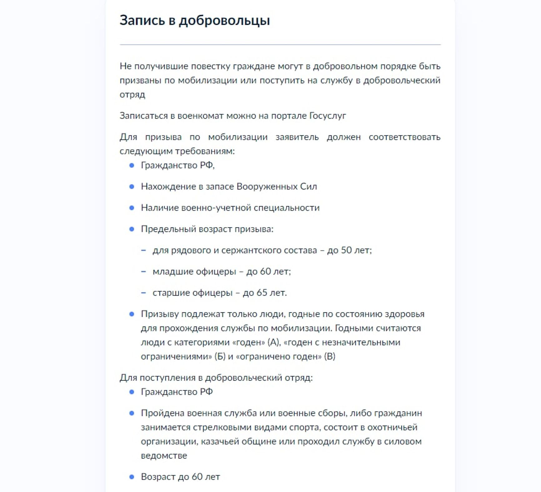Информация на портале уточняет, что призыву подлежат только граждане, соответствующие определенным требованиям. Среди прочего указываются категории «годен» (А), годен с незначительными ограничениями (Б) и ограниченно годен (В). При этом уже зафиксированы случаи, когда в рамках «частичной» мобилизации в России призывают с диагнозом шизофрения, а также набором заболеваний: панкреатитом, ринитом, простатитом, варикозом и геморроем.