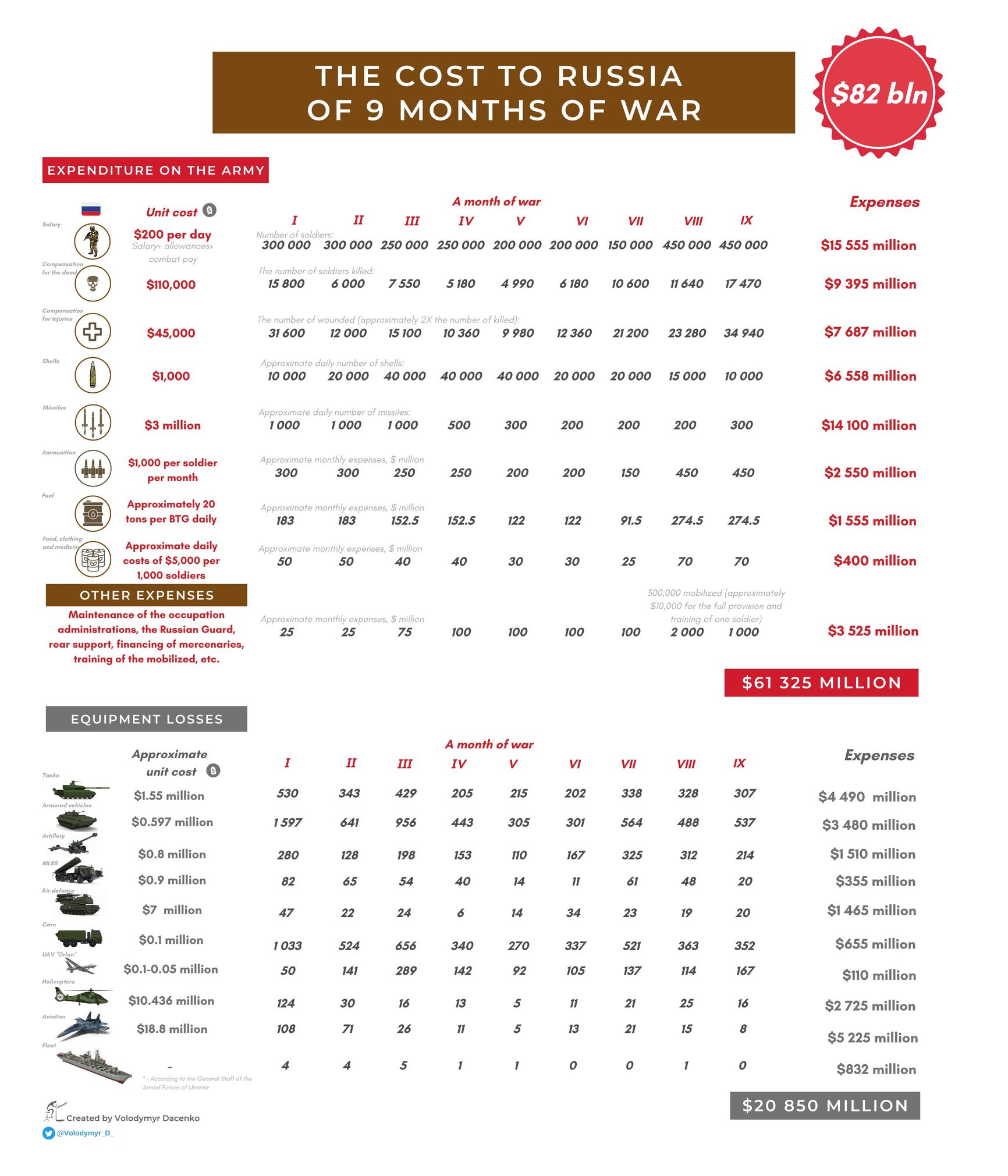 Как сообщал украинский Forbes, прямые военные расходы России за 9 месяцев войны составляют около $82 млрд. Эта смета включает прямые затраты, которые необходимы для поддержки военных операций. Оценка не включает другие расходы на оборону или экономические потери, пишет Даценко. В 2021 году доходы бюджета России составили около $345 млрд (21246,5 млрд рублей). То есть РФ потратила на войну против Украины уже четверть прошлогодних доходов.