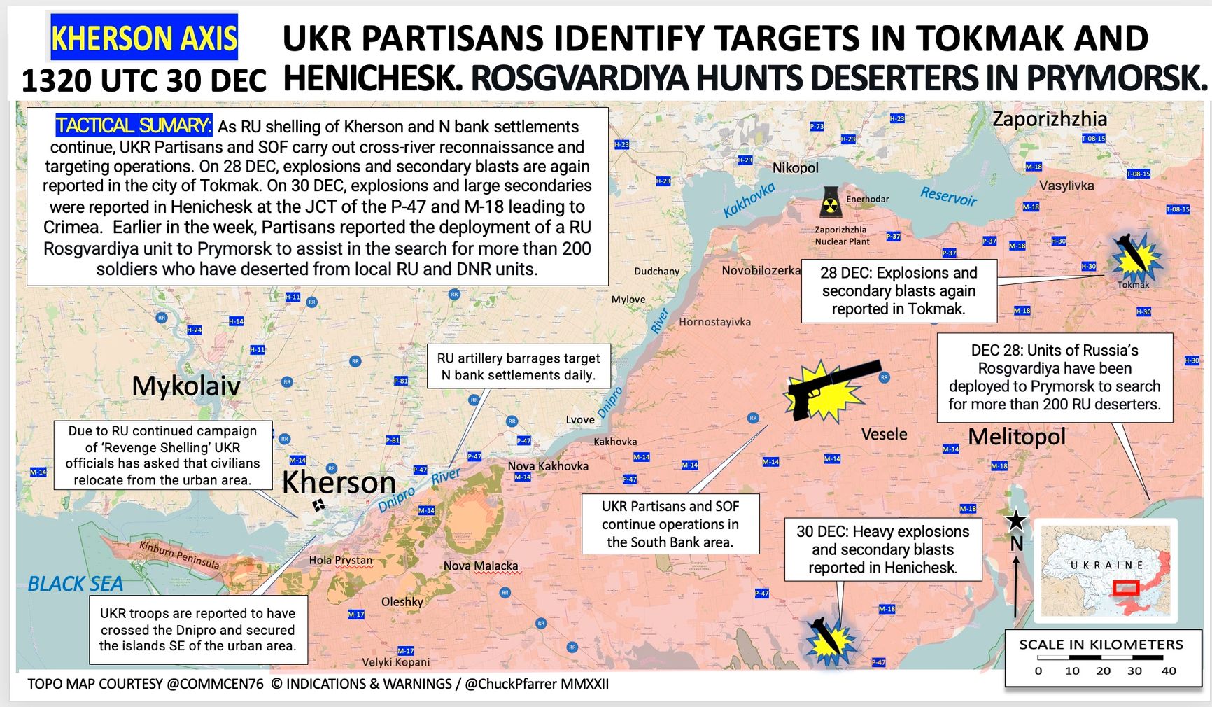 На Херсонском направлении российская сторона продолжает обстрел Херсона и правого берега Днепра, в то время как украинские партизаны и Силы специальных операций проводят разведывательные мероприятия на левом берегу. 30 декабря в Геническе в районе трасс Р-47 (Геническ — Новоалексеевка) и М-18 (Чонгар — Мелитополь) зафиксированы взрывы, сообщает Пфаффер.