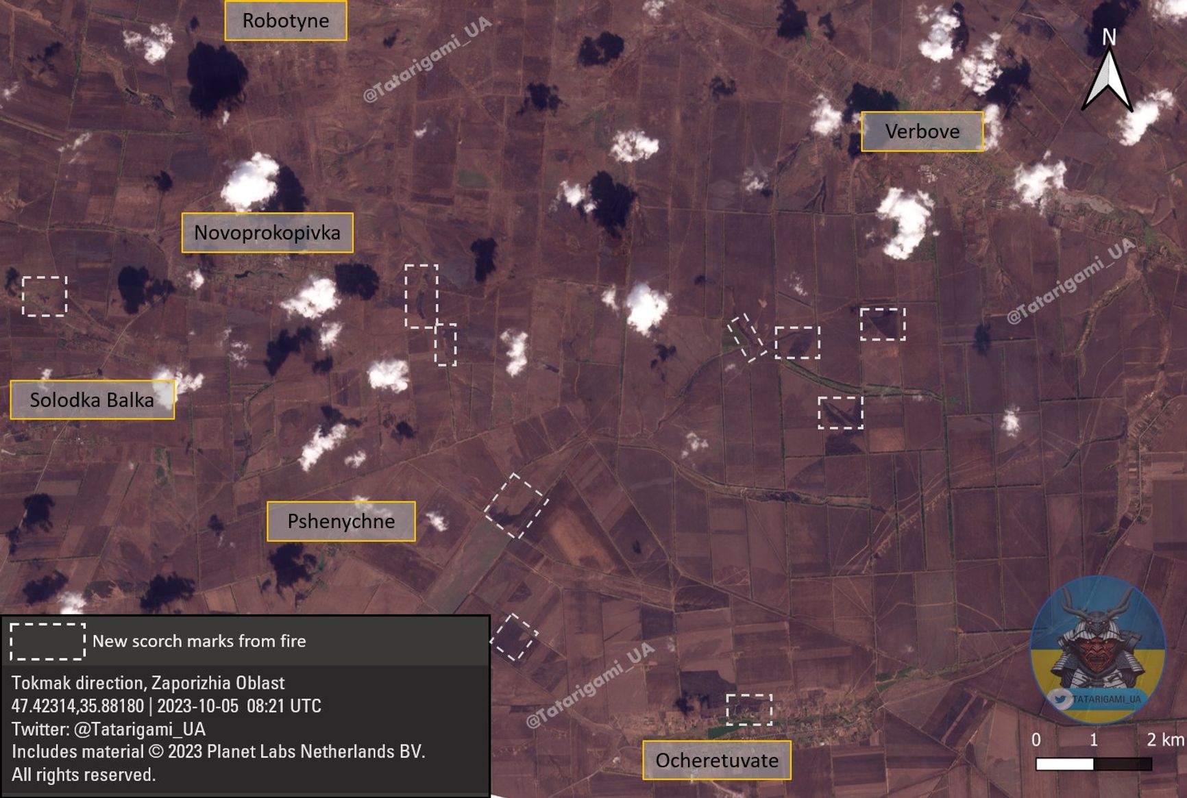 OSINT-исследователь под ником Tatarigami_UA рассказывает о положении в районе Вербового — Очереватого — Новопрокоповки. Согласно анализу спутниковых снимков от 28 сентября и 5 октября, наблюдается смещение областей огневого поражения к востоку от Новопрокоповки и к югу от Вербового. При этом обстановка около Очеретоватого сильных изменений не претерпела. Также отмечается снижение плотности артиллерийских обстрелов, что может свидетельствовать как о смене тактики ВСУ, так и о нехватке боеприпасов или уменьшении интенсивности боевых действий.
