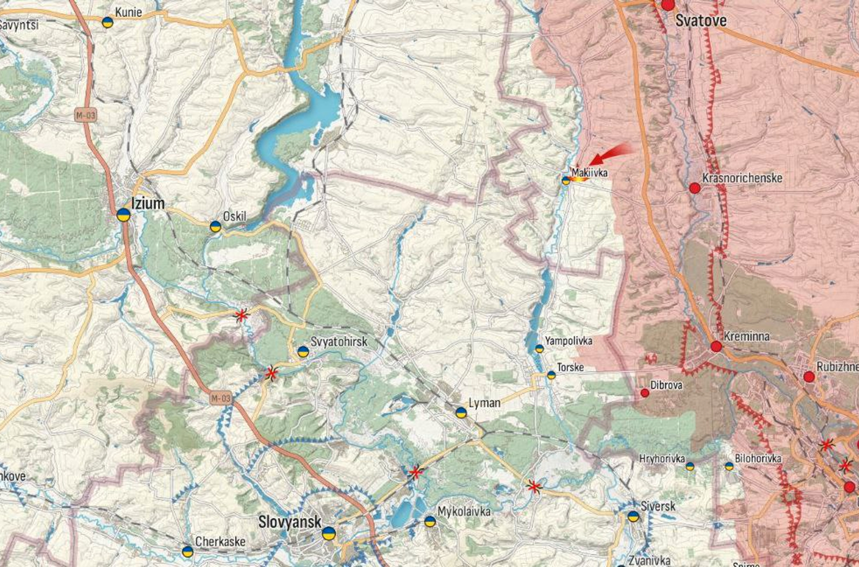 Z-каналы сообщают (1, 2) о наступлении ВС РФ на луганском направлении и продвижении к Макеевке. Как пишет WarGonzo, «налицо начало наступательной операции» с целью «отбросить ВСУ за реку Оскол». Институт изучения войны соглашается с возобновлением активных боевых действий рядом с Купянском, однако считает бóльшую часть размещенных там российских войск небоеспособными.