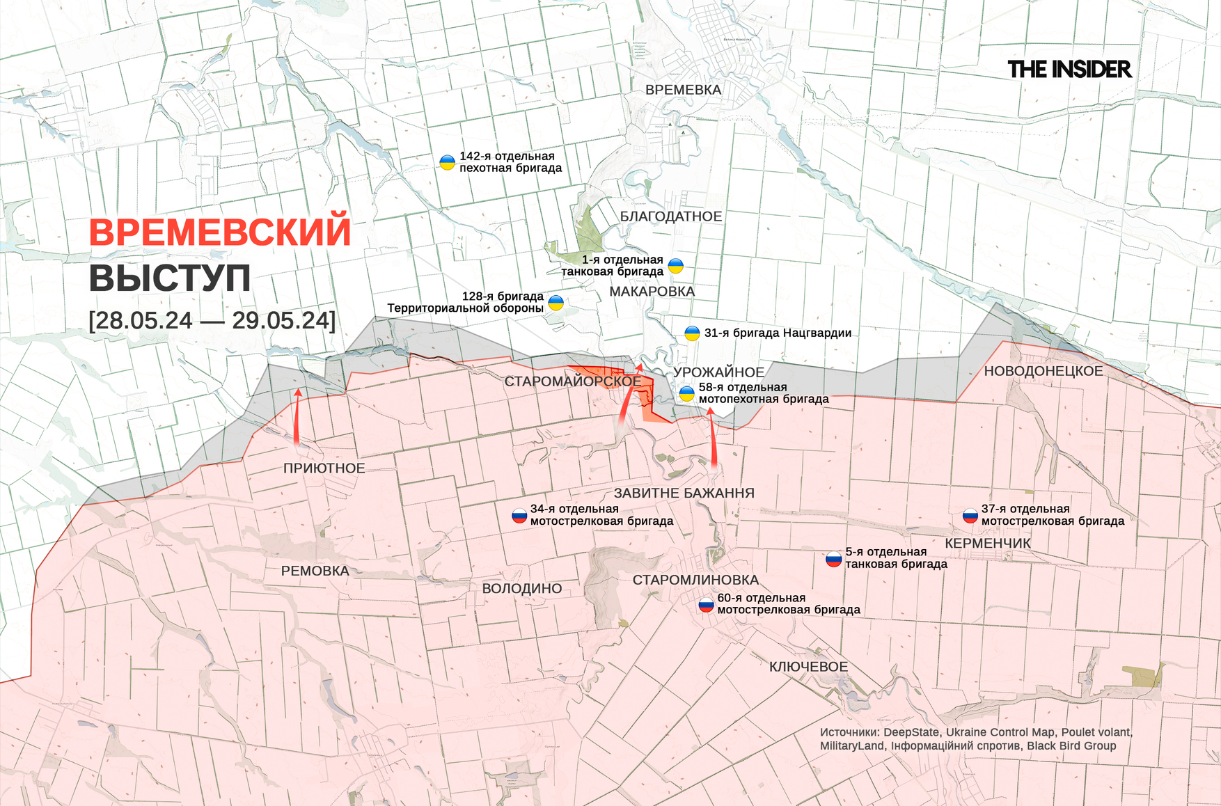 DeepState сообщает о продвижении ВС РФ около Уманского в авдеевском операционном районе и в Старомайорском на Времевском выступе. Тактические успехи на Времевском выступе подтверждаются и «Рыбарем» — по данным авторов проекта, российские войска «отбивают назад» позиции на рубеже Старомайорское — Урожайное, потерянные прошлым летом в ходе контрнаступления ВСУ, но крайне невысокими темпами, измеряемыми сотнями метров в день.
