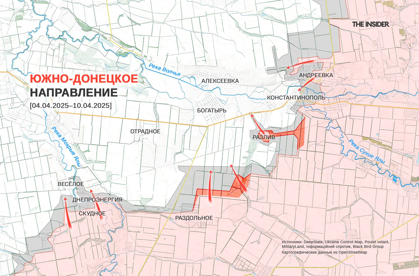 DeepState сообщает о российских тактических успехах около Разлива и Раздольного. Украинский военный обозреватель Константин Машовец ранее предполагал, что после взятия Разлива стоит ожидать увеличения давления на села Отрадное и Богатырь северо-западнее.