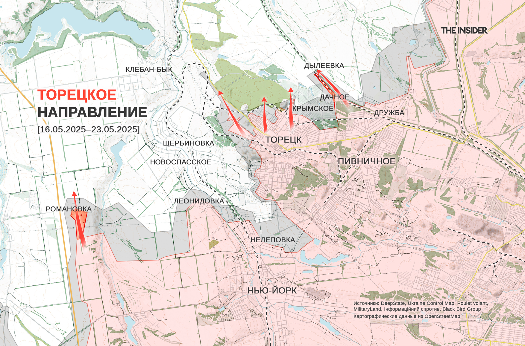 DeepState пишет о продвижении ВС РФ около Дачного (до 2016 года — Горького) севернее Торецка и в Романовке — на фланге к западу от города.