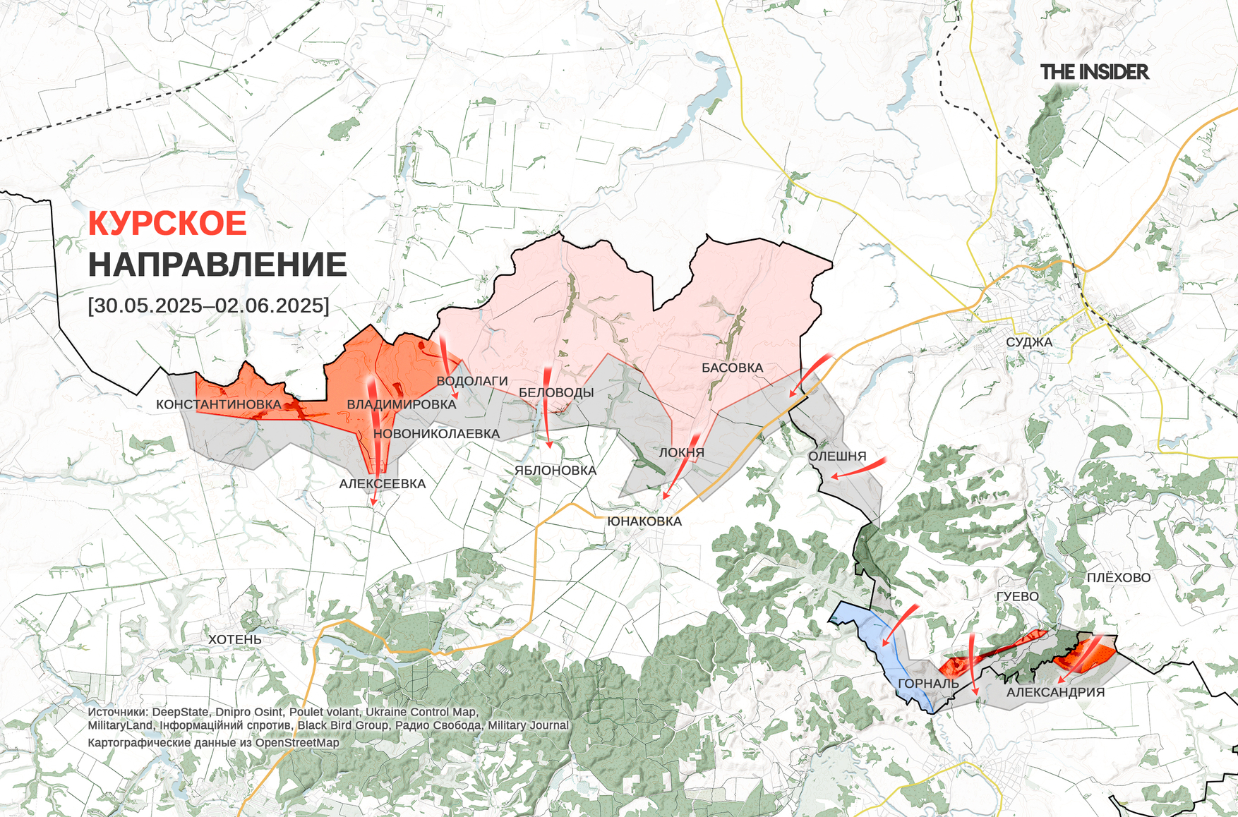 Минобороны РФ заявило о захвате сел Водолаги и Алексеевка в Сумской области. Аналитики DeepState, в свою очередь, признали потерю Владимировки и Константиновки в Сумской области (Минобороны РФ писало о захвате этих населенных пунктов 26 мая и 28 мая соответственно). Оккупацию Алексеевки в DeepState не подтвердили, сообщив только о продвижении противника в этом селе. Также аналитики проекта констатировали продвижение ВС РФ в селе Александрия. Судя по карте проекта, полоса российского наступления в Сумской области увеличилась до 30 км по ширине (с учетом «серой зоны») и до 5–8 км по глубине.