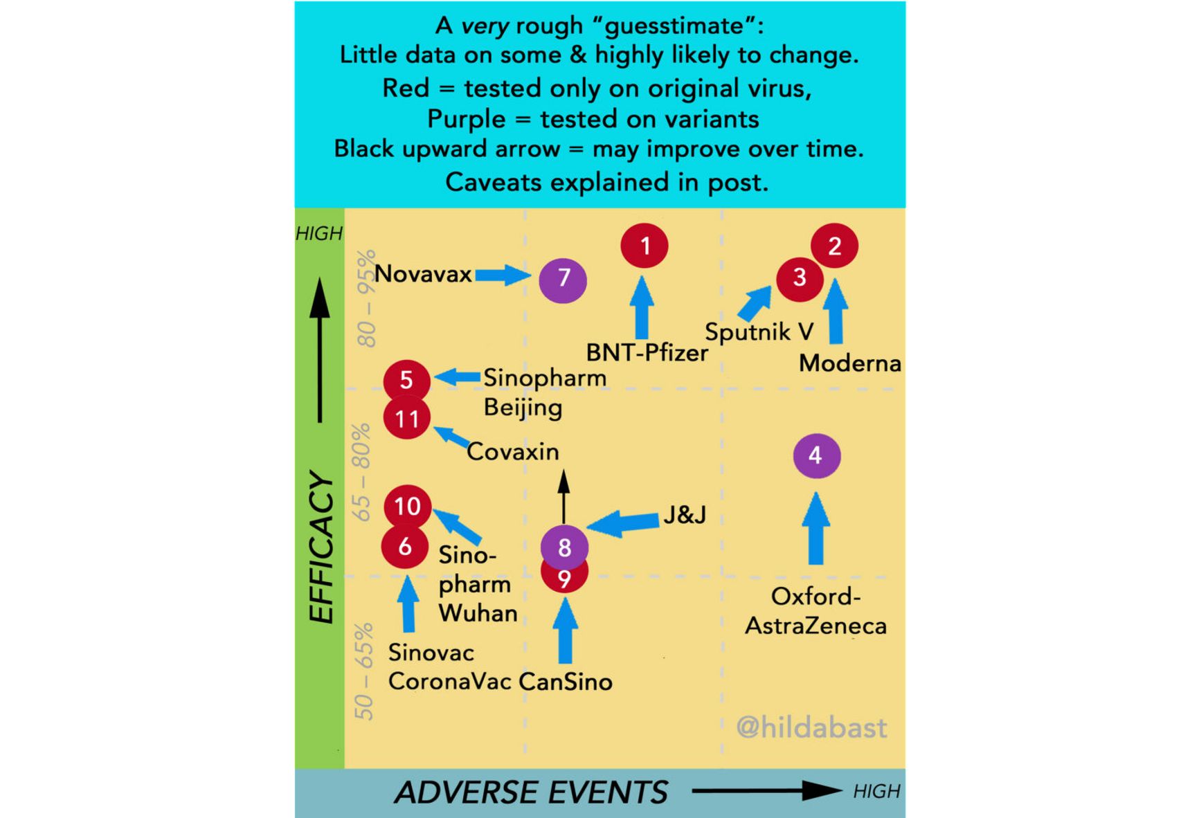 Правда, теперь у нас есть данные реального применения из Аргентины и Сан-Марино (но не из России). Надежно можно оценить разве что безопасность вакцины — количество побочных эффектов в сан-маринском исследовании находится на верхней границе других вакцин. Исследовательница Хильда Бастиан, одна из основателей Кокрейновского общества и эксперт по доказательной медицине, проводит сравнение вакцин по эффективности и безопасности, оговариваясь, что это ориентировочный график, потому что сравнивать данные из разных исследований напрямую не вполне корректно. На рисунке приведены данные на середину мая.